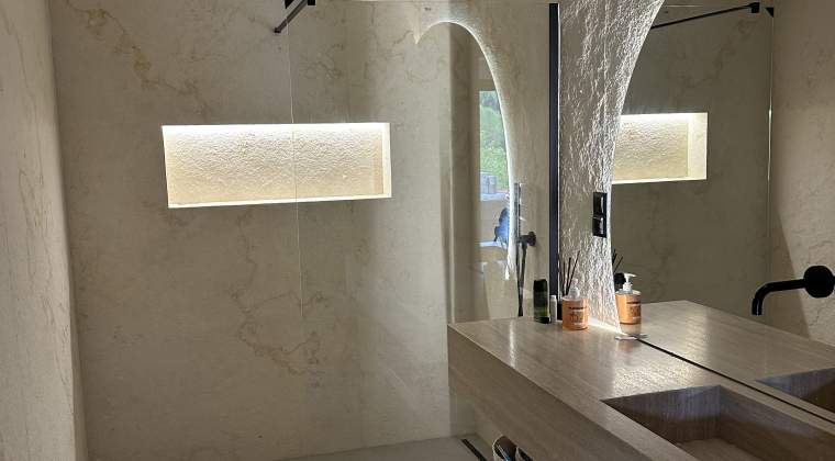 Kamień naturalny cechuje się dużą zmiennością koloru względem zastosowanego oświetlenia oraz ułożenia. Ten sam kamień może zdecydowanie różnić się kiedy oświetlimy go światłem ciepłym vs światło zimne czy dzienne. Nawet ułożenie pionowe vs poziome może wizualnie zmienić odcień kamienia.