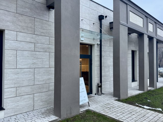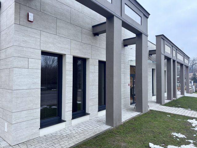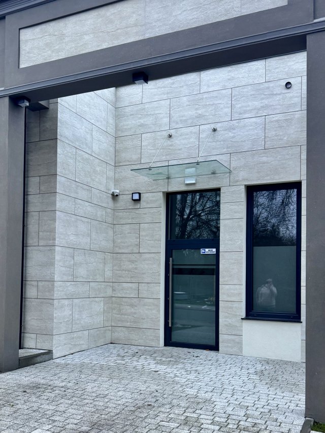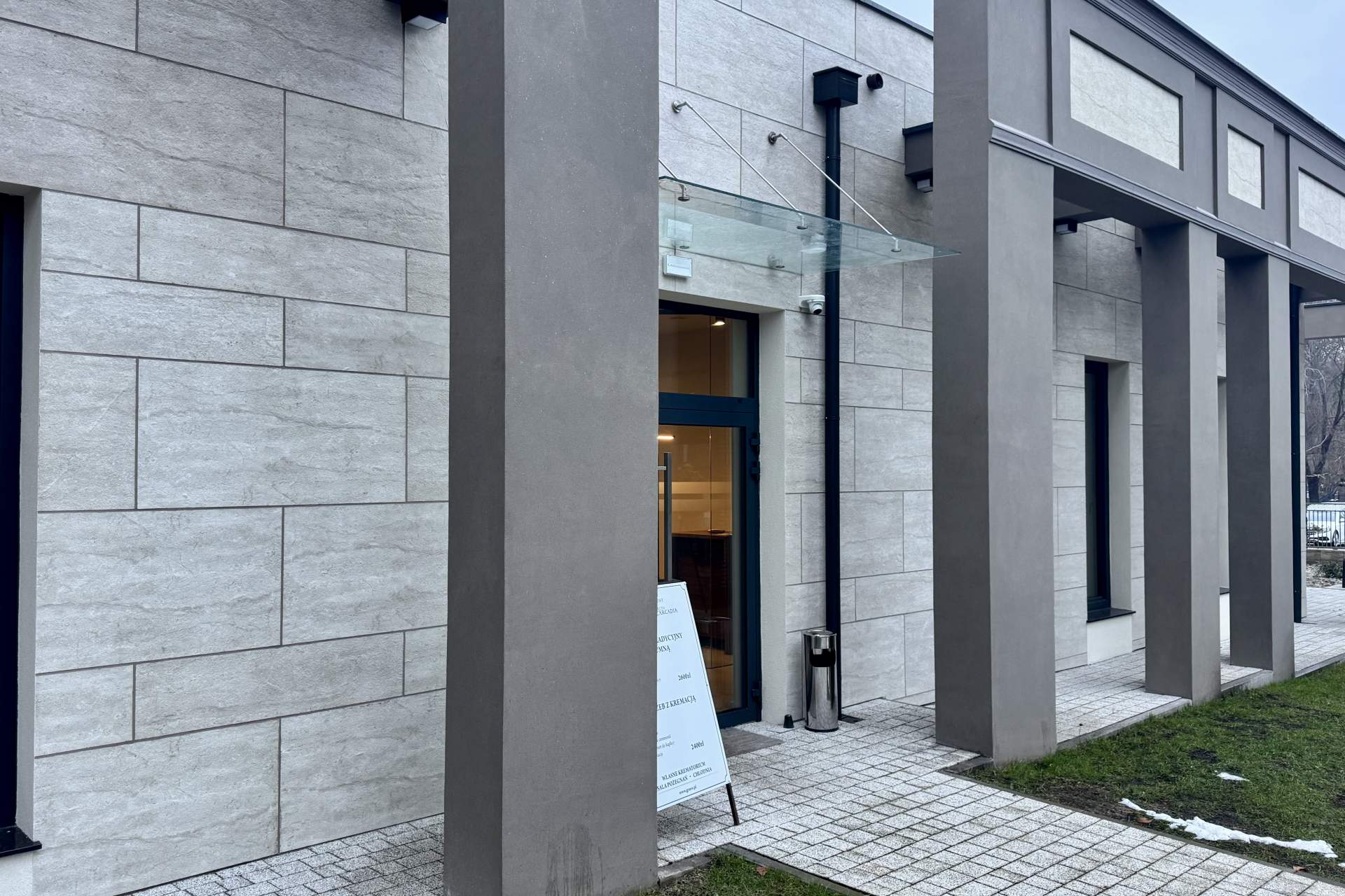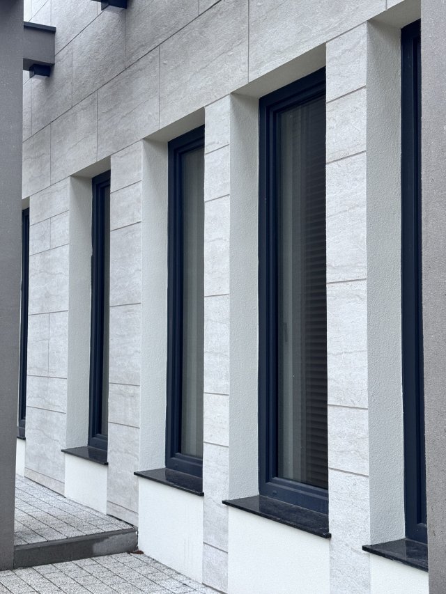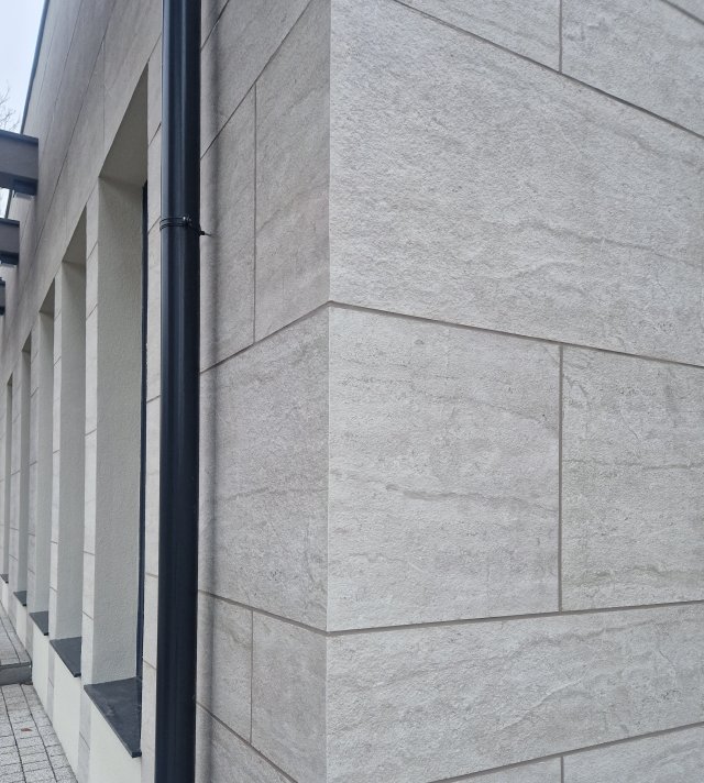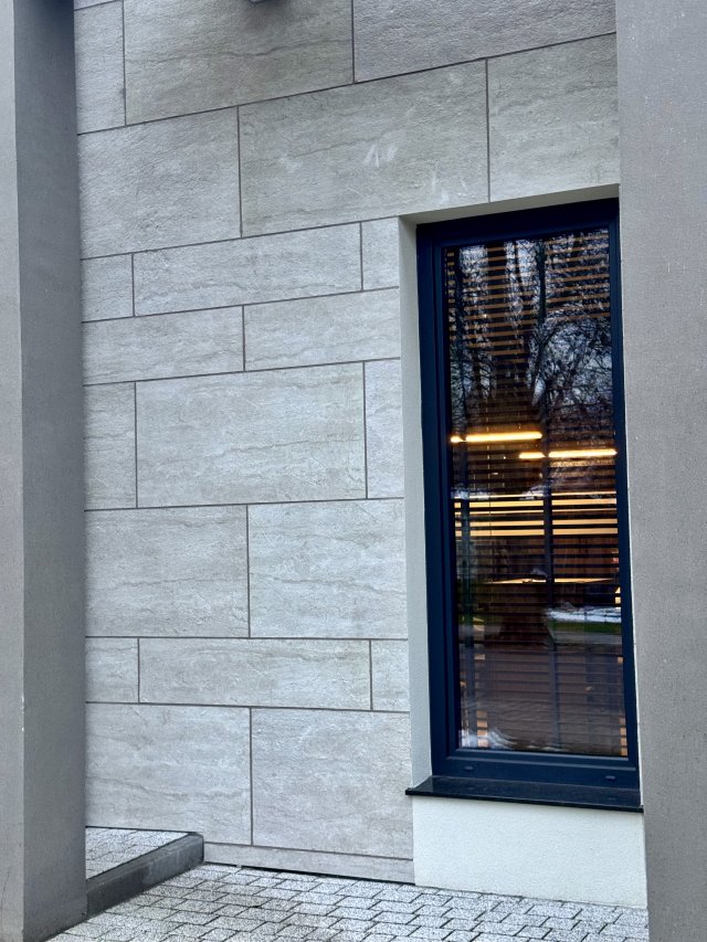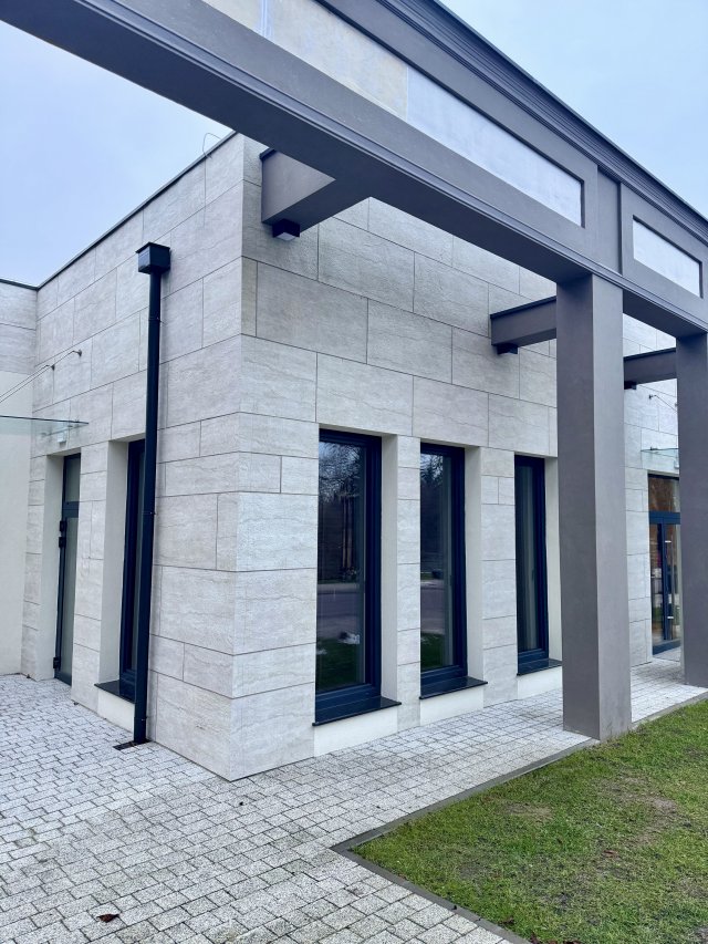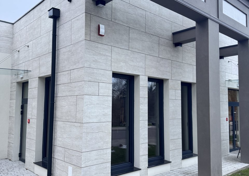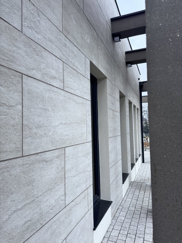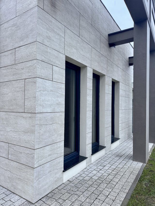 Fasada pokryta fornirem kamiennym Travertino od Stoneland Fornir Travertino na elewacji budynku Klej do forniru kamiennego Impregnat do kamienia Lovestoned Invisible coating Silikon do kamienia PREMIUM OTTOSEAL S70 Skoncentrowany płyn do mycia i pielęgnacji kamienia